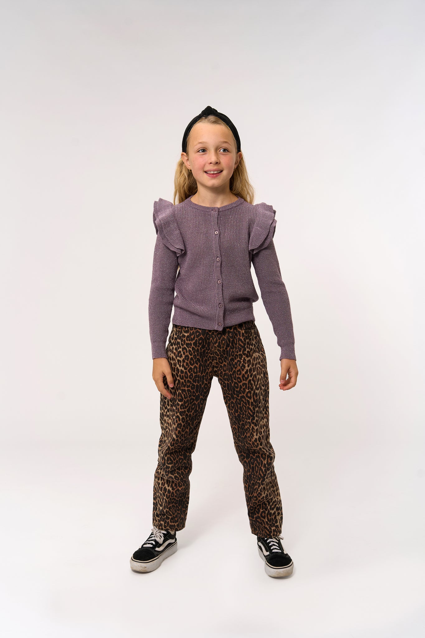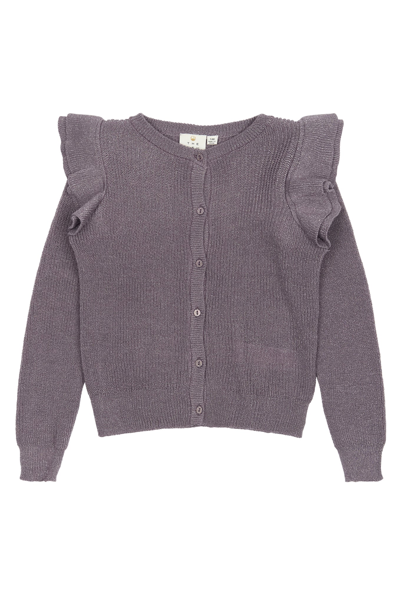 Glitter Cardigan with frill on shoulders front and back with front buttons colour Dusty Purple.