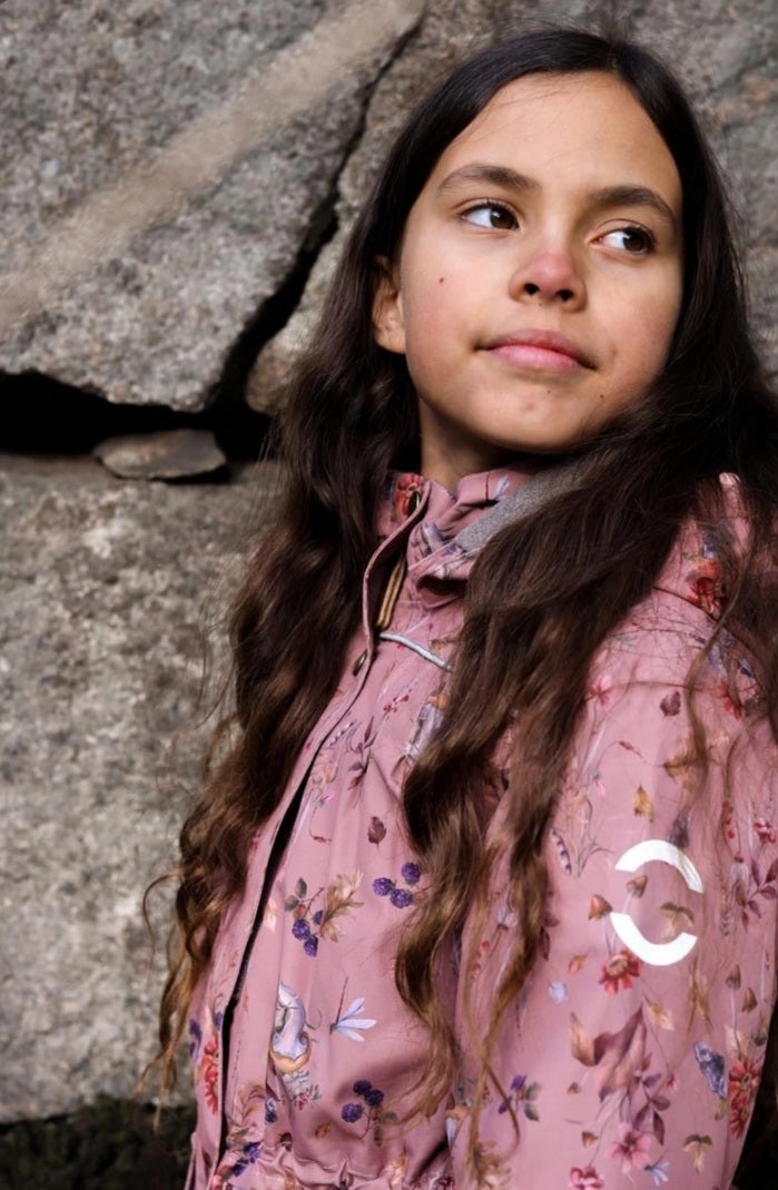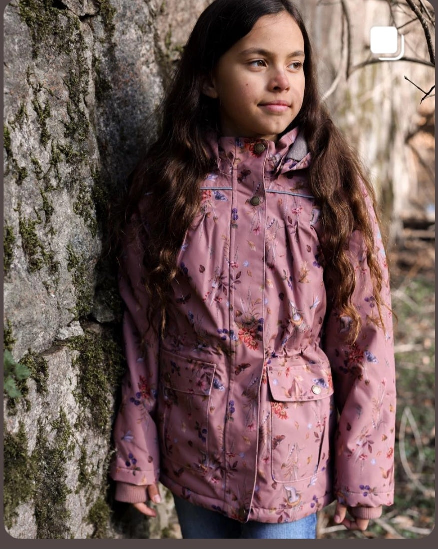 Mikk-line waterproof and windproof wintercoat has fleece lining, with flowers, berries. and mushroom print colour Burlwood Pink.