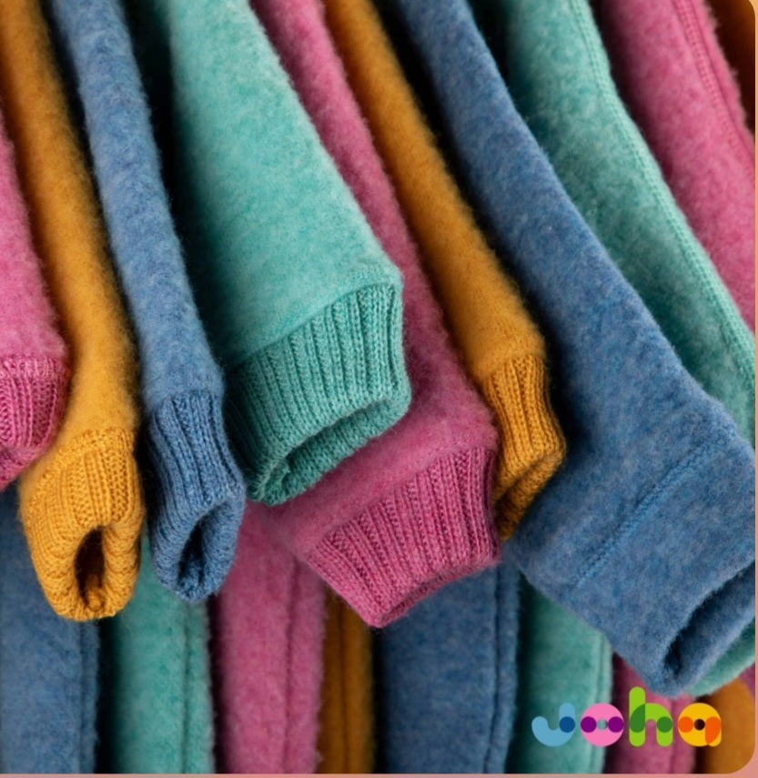 This soft Merino wool outerwear suit has open feet and buttons in front.
