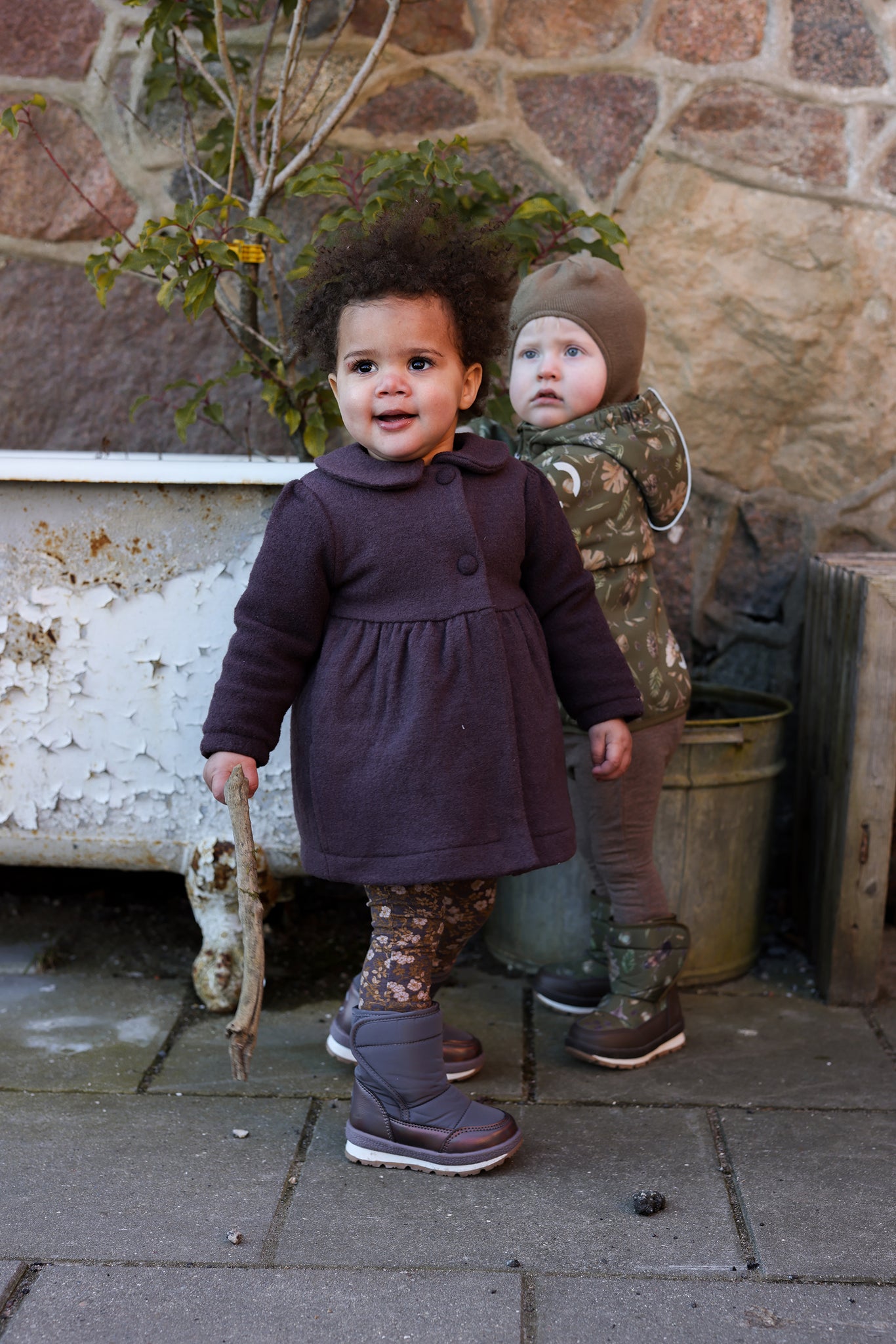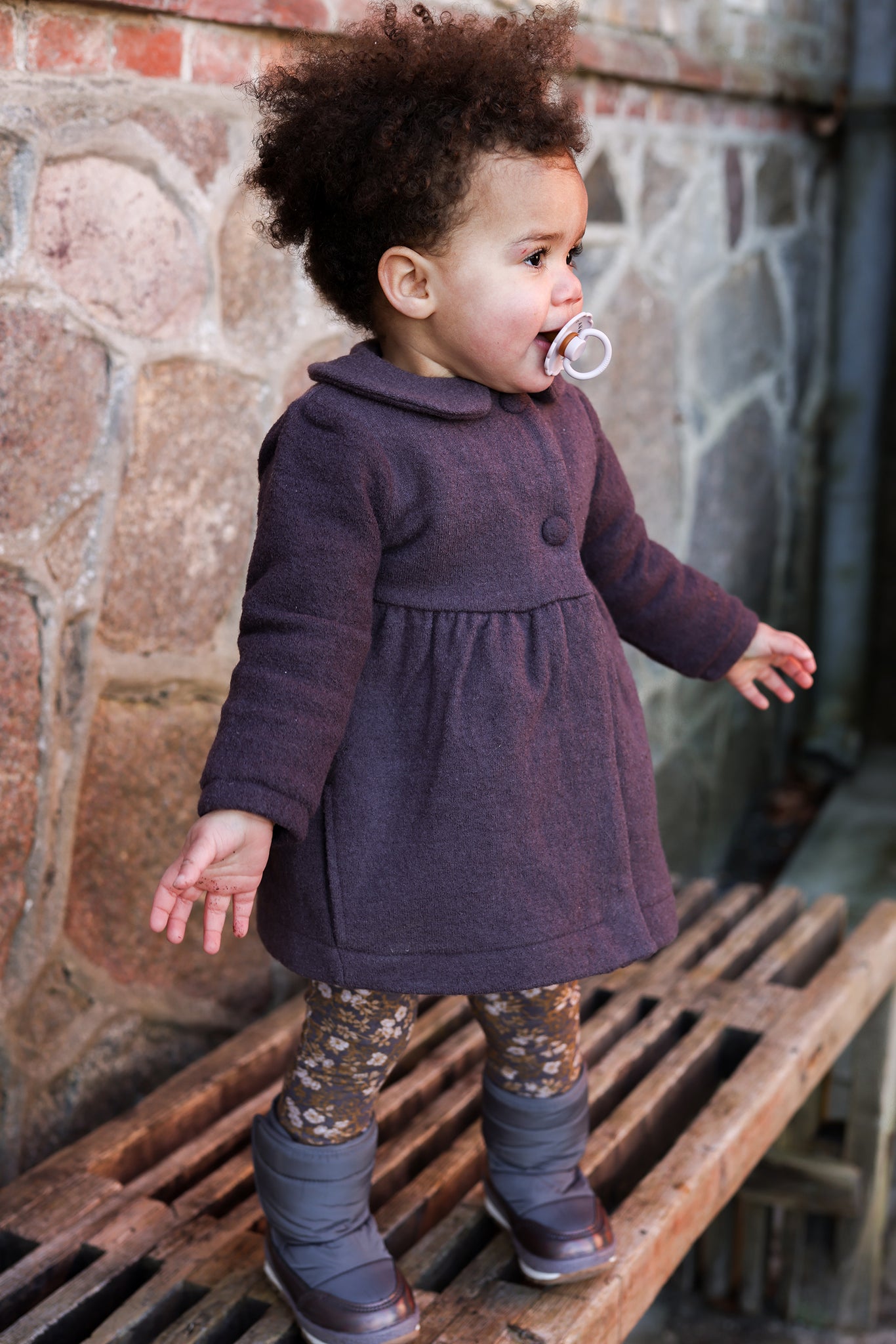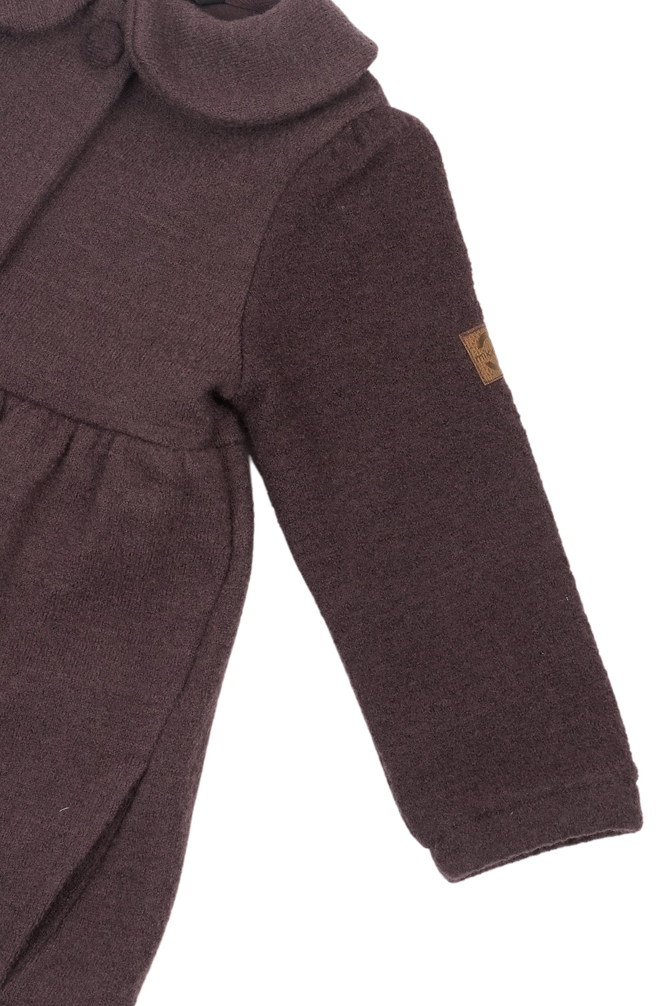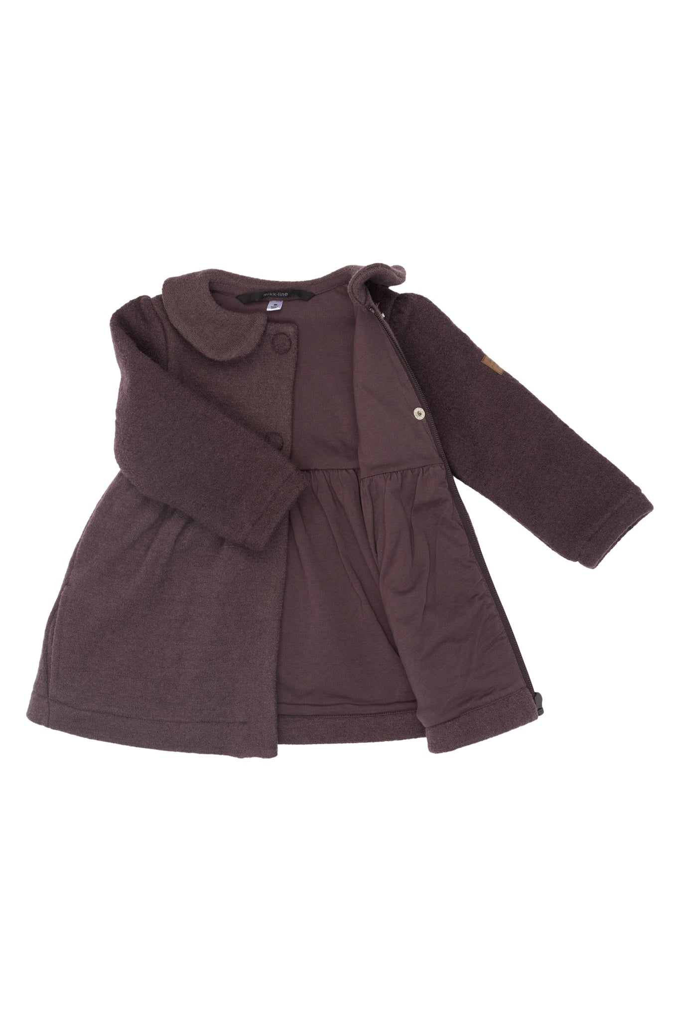 Merino Wool coat with Peter Pan collar and cotton lining colour Marron. This empire waist woolen coat has top front buttons, and has a functional zip for easy on and off.