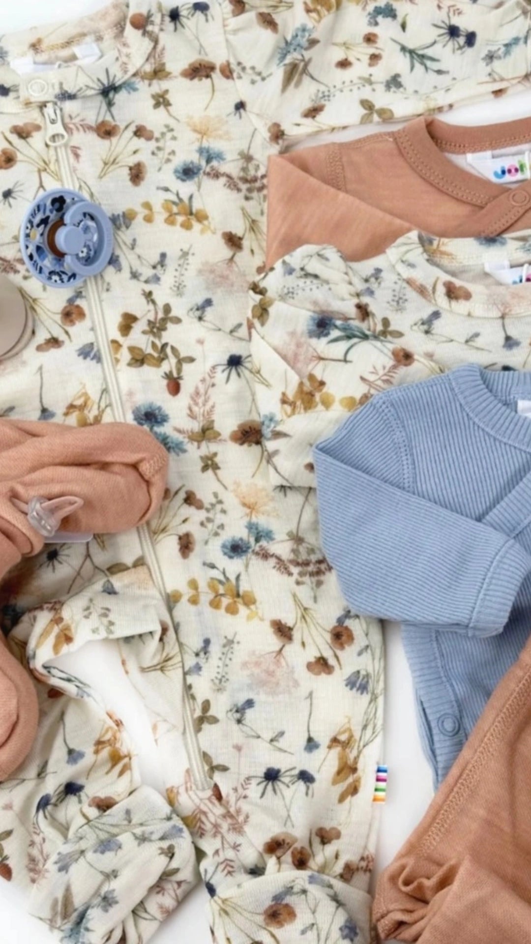 Joha Merino wool babysuit with floral and leaf print colour Off-White. This all- in- one suit has a front zip feet that also be open.
